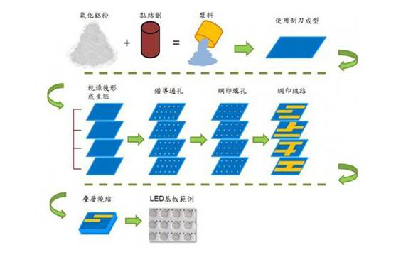 再者,LTCC使用网印方式印制线路,使线路本身具有线径宽度不够精细、以及网版张网问题,导致线路精准度不足、表面平整度不佳等现象,加上多层叠压烧结又有基板收缩比例的问题要考量,并不符合高功率小尺寸的需求,因此在LED产业的应用现在多以高功率大尺寸,或是低功率产品为主。而与LTCC工艺相似的HTCC以1300~1600℃的高温干燥硬化,使生产成本偏高,居于成本考量鲜少现在鲜少使用于LED产业,且HTCC与LTCC有相同的问题,亦不适用于高功率小尺寸的LED产品。