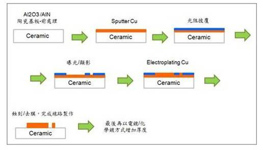 DPC亦称为直接镀铜基板, DPC基板工艺为例:第一时间将陶瓷基板做前处理清洁,利用薄膜专业制造技术-真空镀膜方式于陶瓷基板上溅镀结合于铜金属复合层,接着以黄光微影之光阻被复曝光、显影、蚀刻、去膜工艺完成线路制作,最后再以电镀/化学镀沉积方式增加线路的厚度,待光阻移除后即完成金属化线路制作,详细DPC生产流程图如下图。