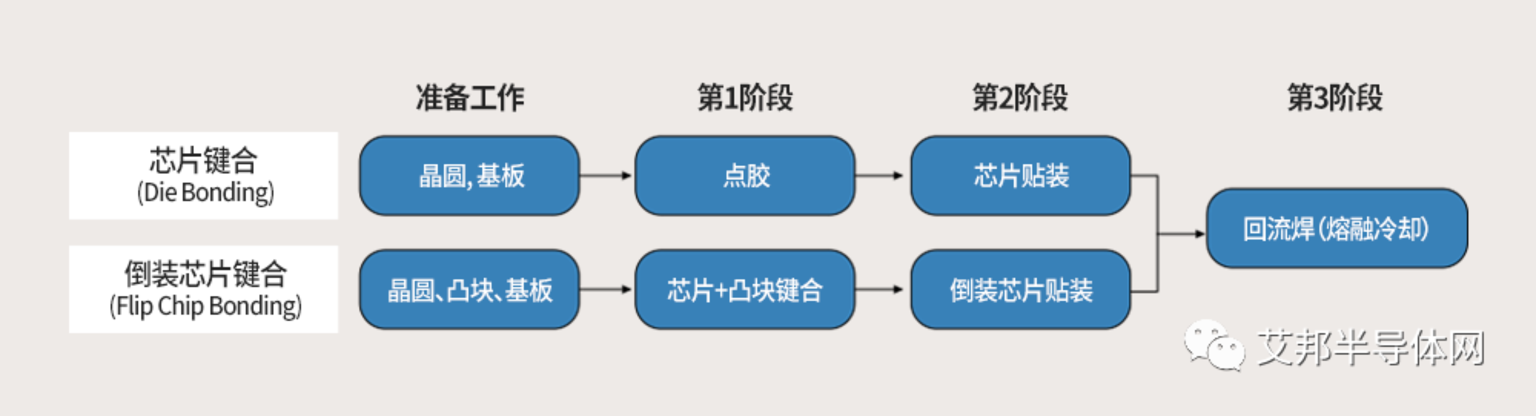 在半导体工艺中,“键合”是指将晶圆芯片固定于基板上。键合工艺可分为传统方法和先进方法两种类型。传统方法采用芯片键合(Die Bonding)(或芯片贴装(Die Attach))和引线键合(Wire Bonding),而先进方法则采用IBM于60年代后期开发的倒装芯片键合(Flip Chip Bonding)技术。倒装芯片键合技术将芯片键合与引线键合相结合,并顺利获得在芯片焊盘上形成凸块(Bump)的方式将芯片和基板连接起来。
