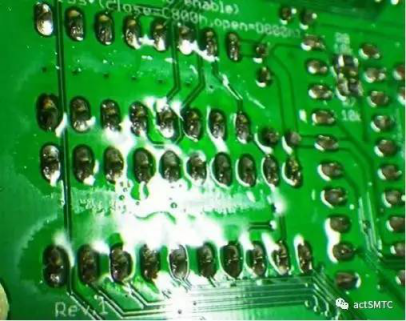 如果没有及时把电路板上的助焊剂残留物清洗掉,腐蚀的有害影响甚至在电路板还未出厂就可能发生。下面是在电路板离开生产线两小时后拍到的水溶性助焊剂腐蚀的照片。水溶性助焊剂残留物污染引起的另一种潜在的故障模式是生长树突,树突是呈毛发状生长的金属须,可能会在相邻的导体间形成并造成短路。